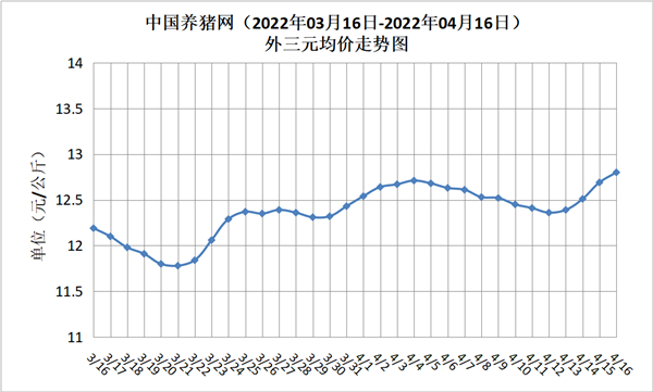 2022年03月16日-2022年04月16日中国养猪网生猪(外三元)均价走势图