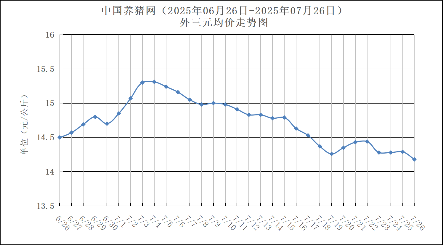 2025年06月26日-2025年07月26日中国养猪网生猪(外三元)均价走势图