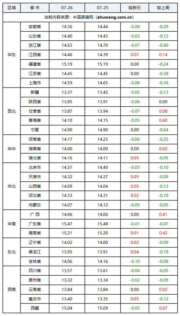 2025年07月26日-中国养猪网生猪(外三元)均价涨跌表