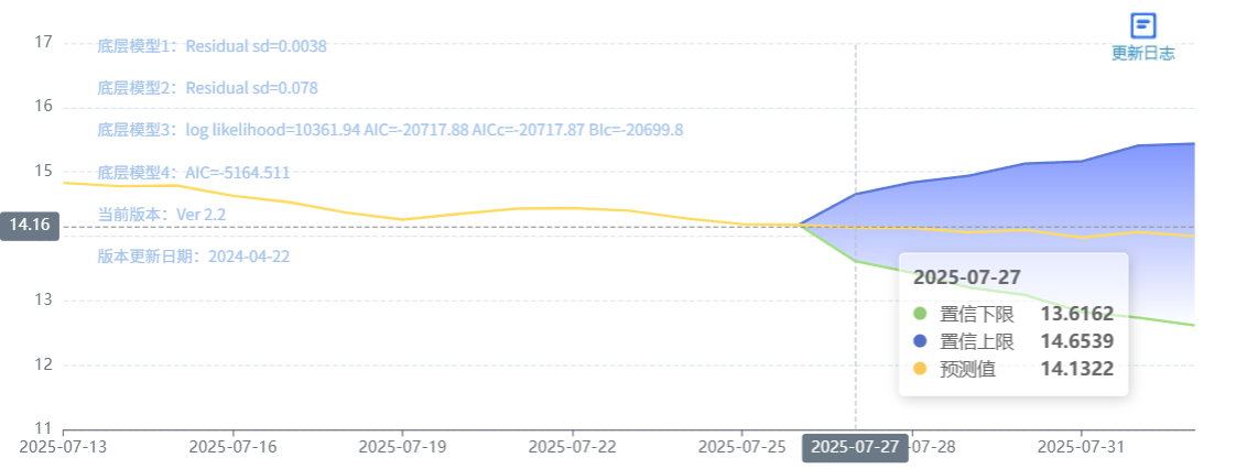 玄田算法是由项目课题组团队原创的非经典逻辑数值聚合理论和不确定性预测方法,构建了基于一致模算子的生猪价格预测模型。该模型采用的聚合函数及一致模相关理论与方法已获得多项国家自然科学基金和省级自然科学资金资助,并获得多项省级自然科学奖奖项。07月27日预测猪价为14.1322,置信区间在13.6162--14.6539之间。07月28日预测猪价为14.1323;07月29日预测猪价为14.0648。