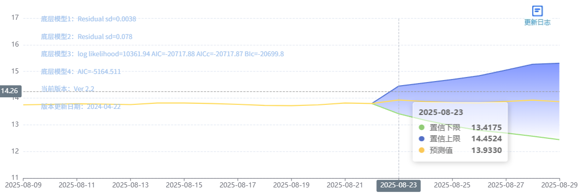 玄田算法是由项目课题组团队原创的非经典逻辑数值聚合理论和不确定性预测方法,构建了基于一致模算子的生猪价格预测模型。该模型采用的聚合函数及一致模相关理论与方法已获得多项国家自然科学基金和省级自然科学资金资助,并获得多项省级自然科学奖奖项。08月23日预测猪价为13.9330,置信区间在13.4175--14.4524之间。08月24日预测猪价为13.8732;08月25日预测猪价为13.8352。