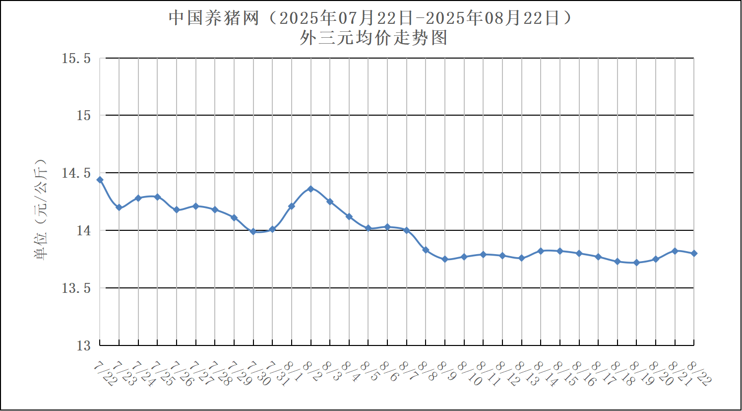 2025年07月22日-2025年08月22日中国养猪网生猪(外三元)均价走势图