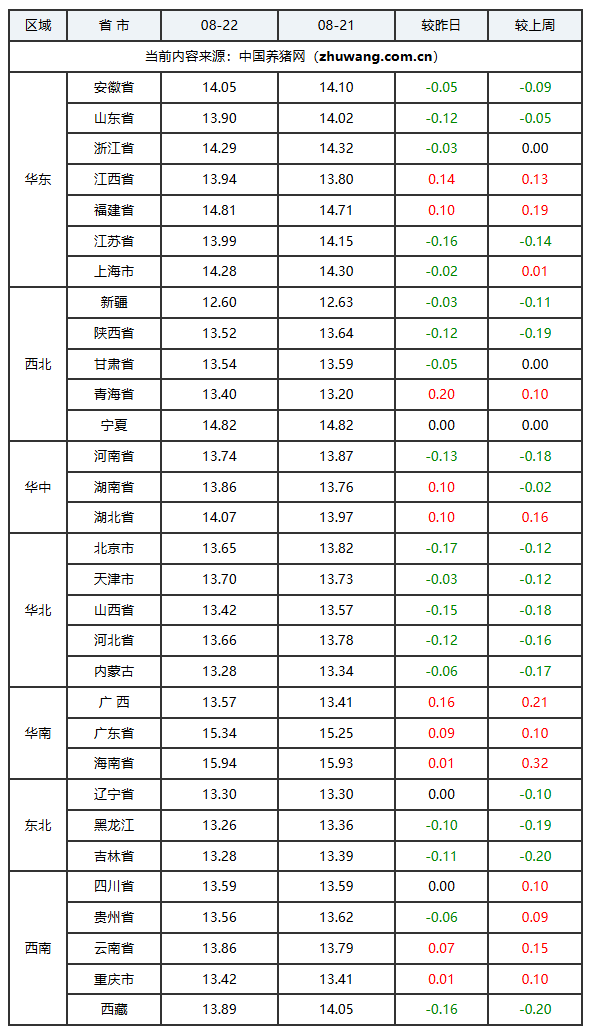 2025年08月22日-中国养猪网生猪(外三元)均价涨跌表