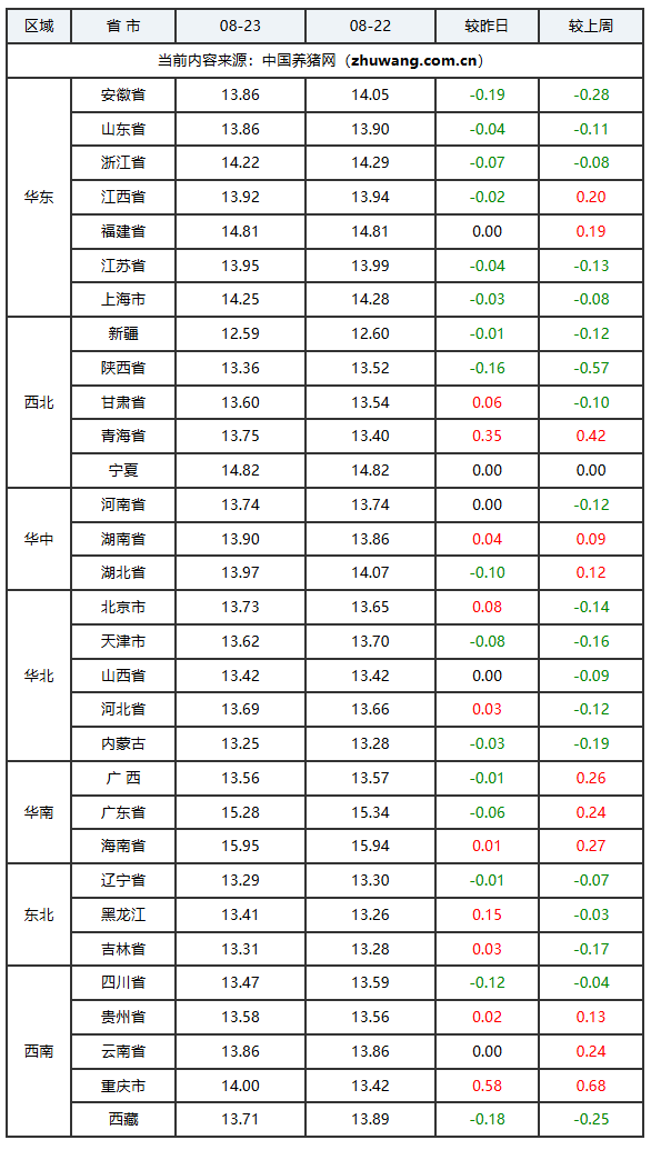 2025年08月23日-中国养猪网生猪(外三元)均价涨跌表