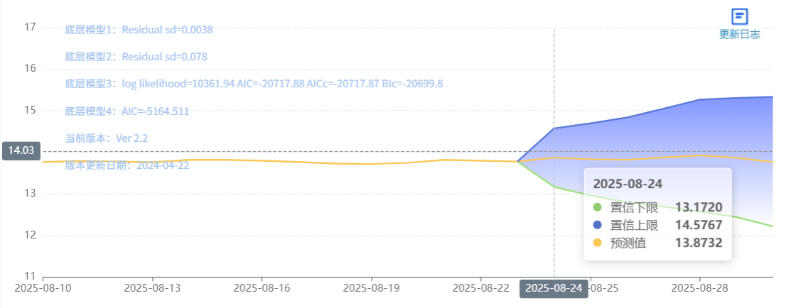 玄田算法是由项目课题组团队原创的非经典逻辑数值聚合理论和不确定性预测方法,构建了基于一致模算子的生猪价格预测模型。该模型采用的聚合函数及一致模相关理论与方法已获得多项国家自然科学基金和省级自然科学资金资助,并获得多项省级自然科学奖奖项。08月24日预测猪价为13.8732,置信区间在13.1720--14.5767之间。08月25日预测猪价为13.8352;08月26日预测猪价为13.8233。