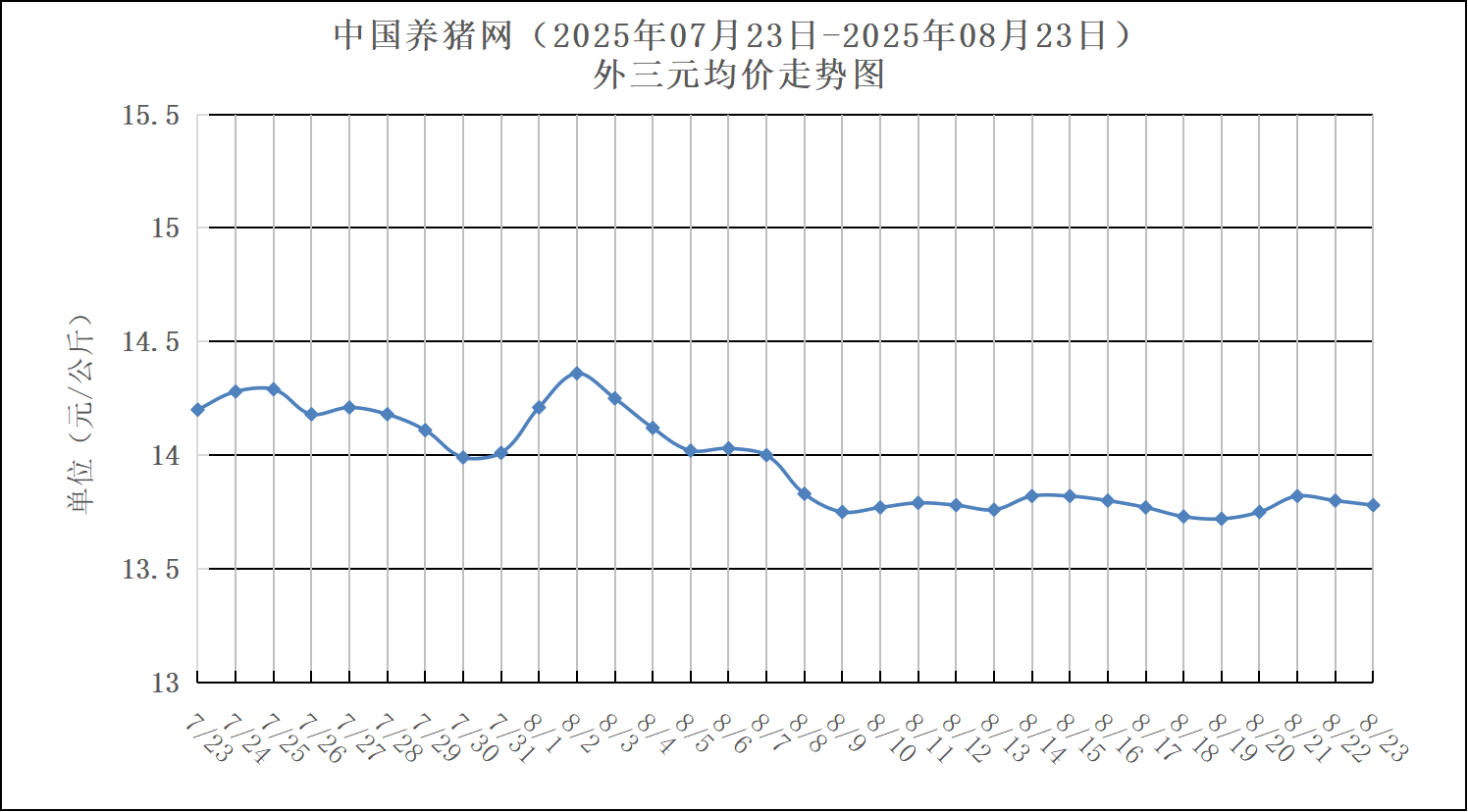 2025年07月23日-2025年08月23日中国养猪网生猪(外三元)均价走势图