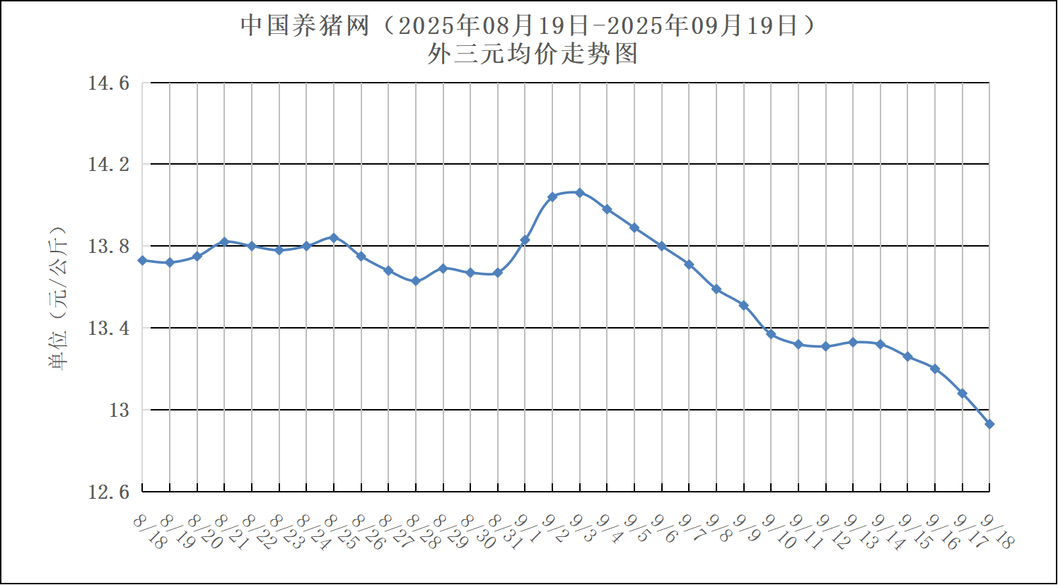 2025年08月18日-2025年09月18日中国养猪网生猪(外三元)均价走势图