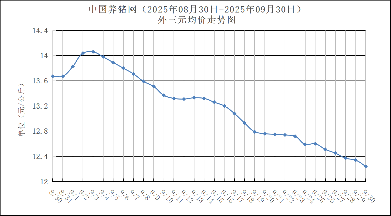 2025年08月30日-2025年09月30日中国养猪网生猪(外三元)均价走势图
