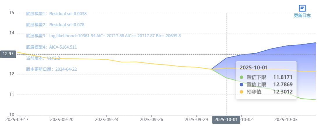 玄田算法是由项目课题组团队原创的非经典逻辑数值聚合理论和不确定性预测方法,构建了基于一致模算子的生猪价格预测模型。该模型采用的聚合函数及一致模相关理论与方法已获得多项国家自然科学基金和省级自然科学资金资助,并获得多项省级自然科学奖奖项。10月01日预测猪价为12.3012,置信区间在11.8171--12.7869之间。10月02日预测猪价为12.2792;10月03日预测猪价为12.1959。