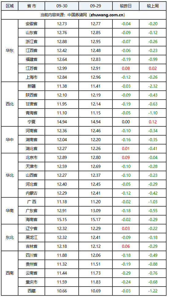 2025年09月30日-中国养猪网生猪(外三元)均价涨跌表