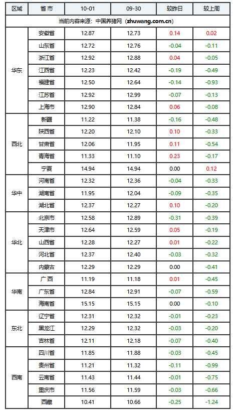 2025年10月01日-中国养猪网生猪(外三元)均价涨跌表