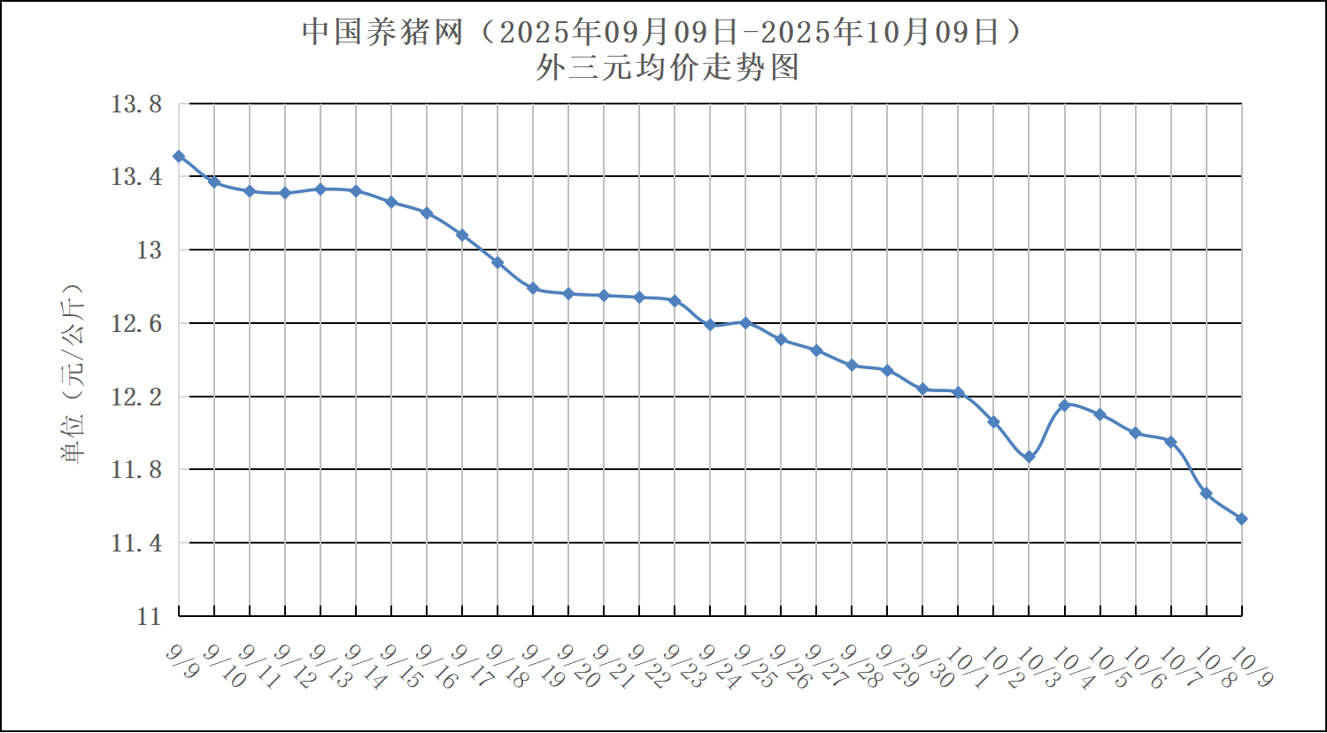 2025年10月09日-中国养猪网生猪(外三元)均价涨跌表