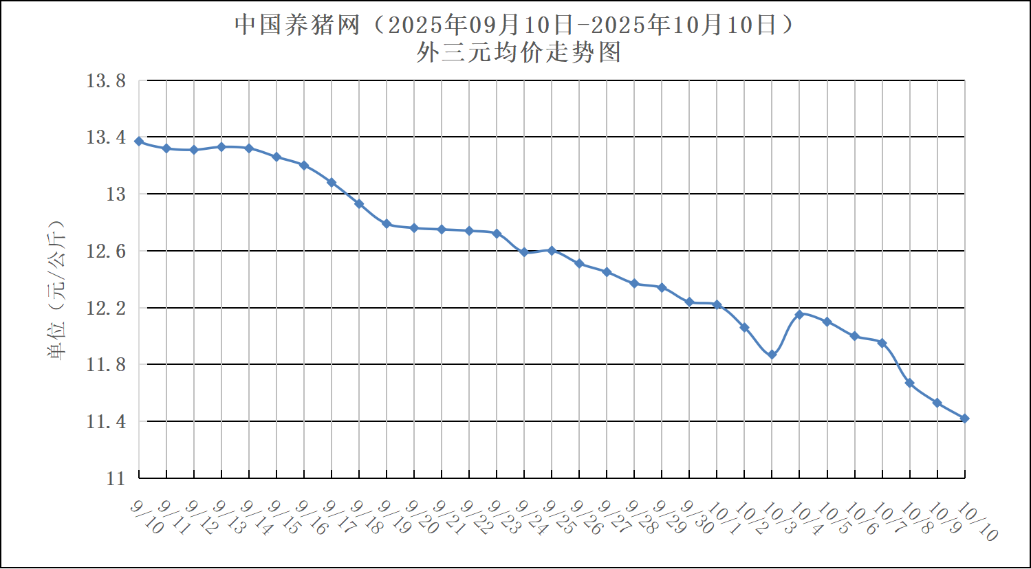 2025年09月10日-2025年10月10日中国养猪网生猪(外三元)均价走势图