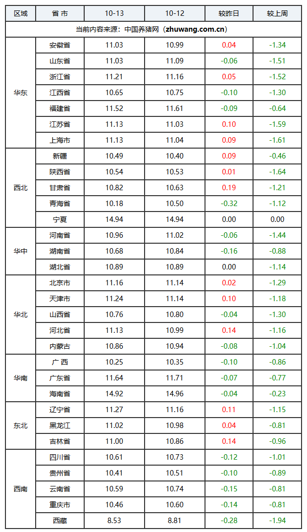 2025年10月13日-中国养猪网生猪(外三元)均价涨跌表