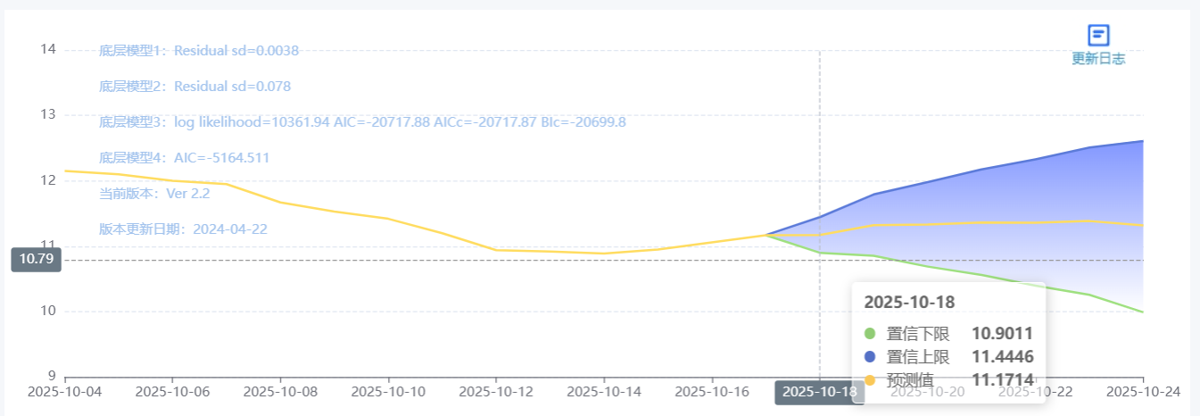 玄田算法是由项目课题组团队原创的非经典逻辑数值聚合理论和不确定性预测方法,构建了基于一致模算子的生猪价格预测模型。该模型采用的聚合函数及一致模相关理论与方法已获得多项国家自然科学基金和省级自然科学资金资助,并获得多项省级自然科学奖奖项。10月18日预测猪价为11.1714,置信区间在10.9011--11.4446之间。10月19日预测猪价为11.3218;10月20日预测猪价为11.3322。