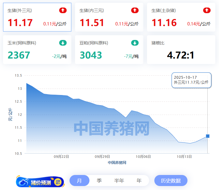 2025年10月17日(星期五),中国养猪网猪价系统数据监测如下:生猪(品种:外三元)均价为11.17元/公斤(5.59元/斤),价格较昨日上涨了0.11元/公斤(0.06元/斤);猪价环比下跌14.6%,同比下跌36.75%。