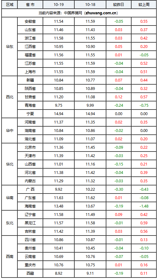 2025年10月19日-中国养猪网生猪(外三元)均价涨跌表