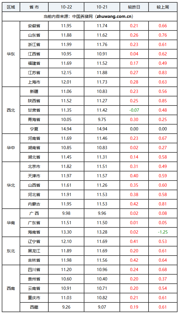 2025年10月22日-中国养猪网生猪(外三元)均价涨跌表
