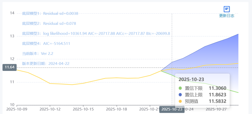 玄田算法是由项目课题组团队原创的非经典逻辑数值聚合理论和不确定性预测方法,构建了基于一致模算子的生猪价格预测模型。该模型采用的聚合函数及一致模相关理论与方法已获得多项国家自然科学基金和省级自然科学资金资助,并获得多项省级自然科学奖奖项。10月23日预测猪价为11.3766,置信区间在10.9095--11.8482之间。10月24日预测猪价为11.3619;10月25日预测猪价为11.4687。