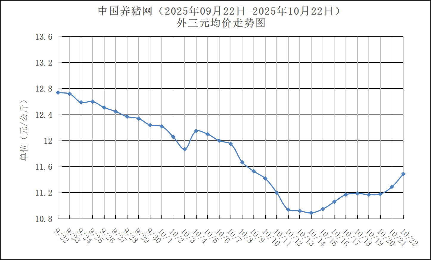 2025年10月22日(星期三),中国养猪网猪价系统数据监测如下:生猪(品种:外三元)均价为11.49元/公斤(5.75元/斤),价格较昨日上涨了0.20元/公斤(0.10元/斤);猪价环比下跌9.81%,同比下跌33.55%。