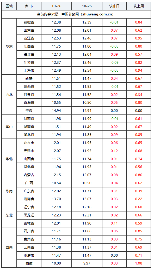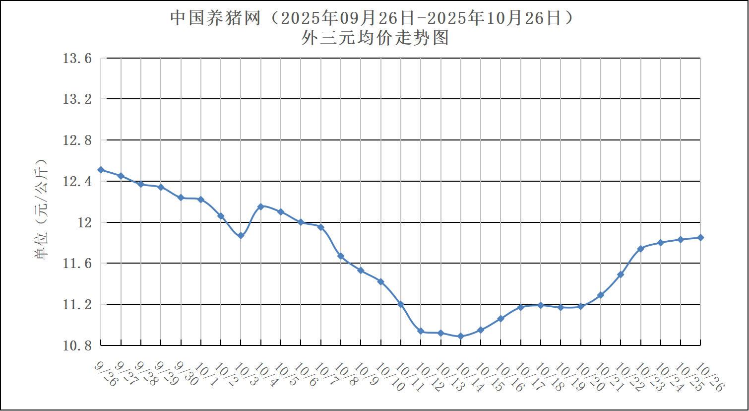 2025年10月26日-中国养猪网生猪(外三元)均价涨跌表