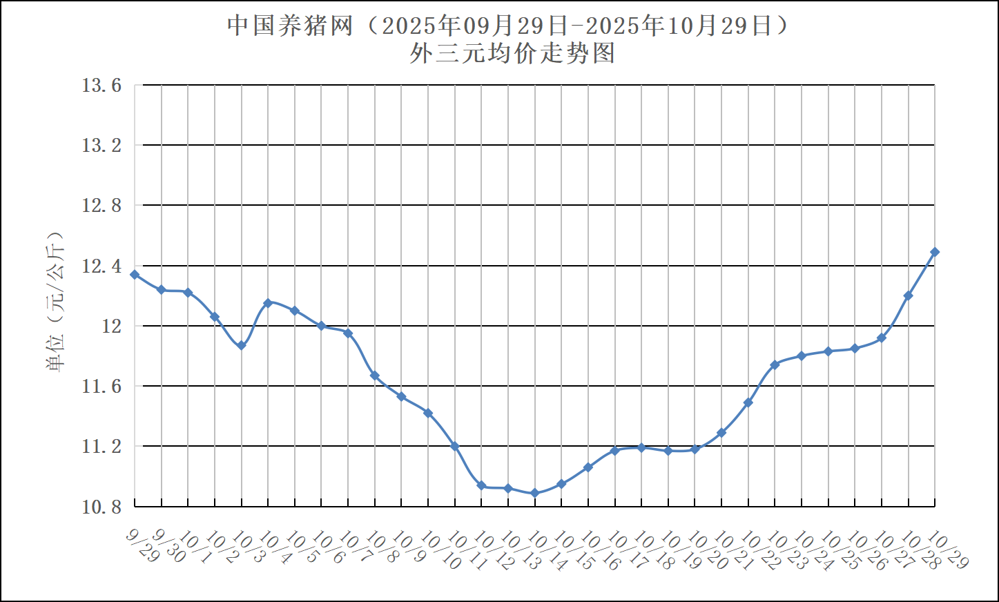 2025年10月29日-中国养猪网生猪(外三元)均价走势图
