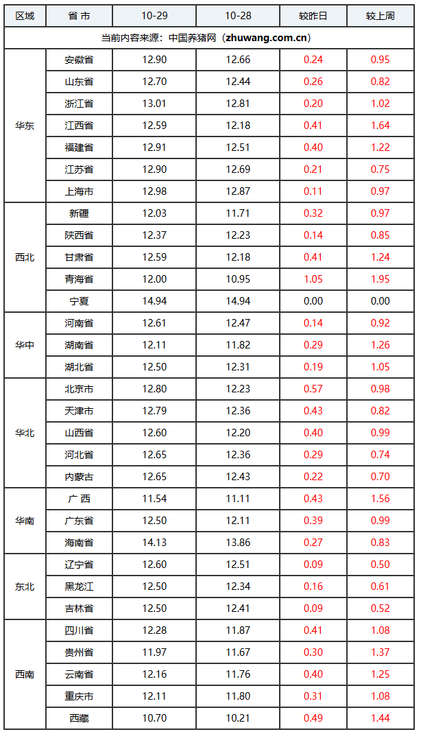 2025年10月29日-中国养猪网生猪(外三元)均价涨跌表