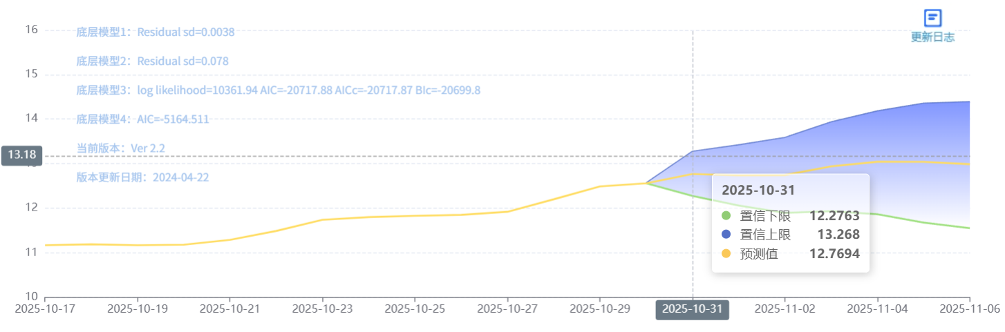 玄田算法是由项目课题组团队原创的非经典逻辑数值聚合理论和不确定性预测方法,构建了基于一致模算子的生猪价格预测模型。该模型采用的聚合函数及一致模相关理论与方法已获得多项国家自然科学基金和省级自然科学资金资助,并获得多项省级自然科学奖奖项。10月31日预测猪价为12.7694,置信区间在12.2763--13.268之间。11月01日预测猪价为12.7375;11月02日预测猪价为12.7438。