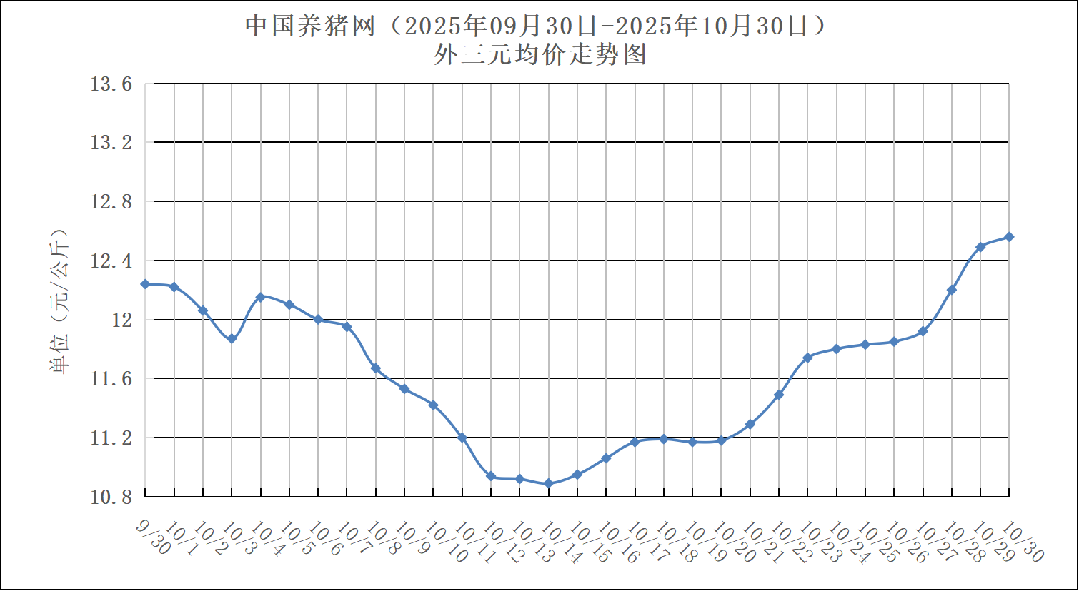 2025年10月30日(星期四),中国养猪网猪价系统数据监测如下:生猪(品种:外三元)均价为12.56元/公斤(6.28元/斤),价格较昨日上涨了0.07元/公斤(0.035元/斤);猪价环比上涨2.61%,同比下跌27.02%。