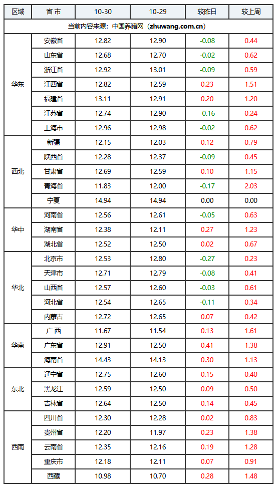 2025年10月30日-中国养猪网生猪(外三元)均价涨跌表