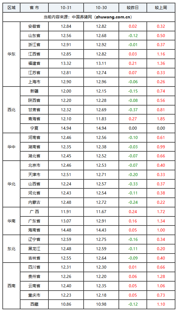 2025年10月31日-中国养猪网生猪(外三元)均价涨跌表