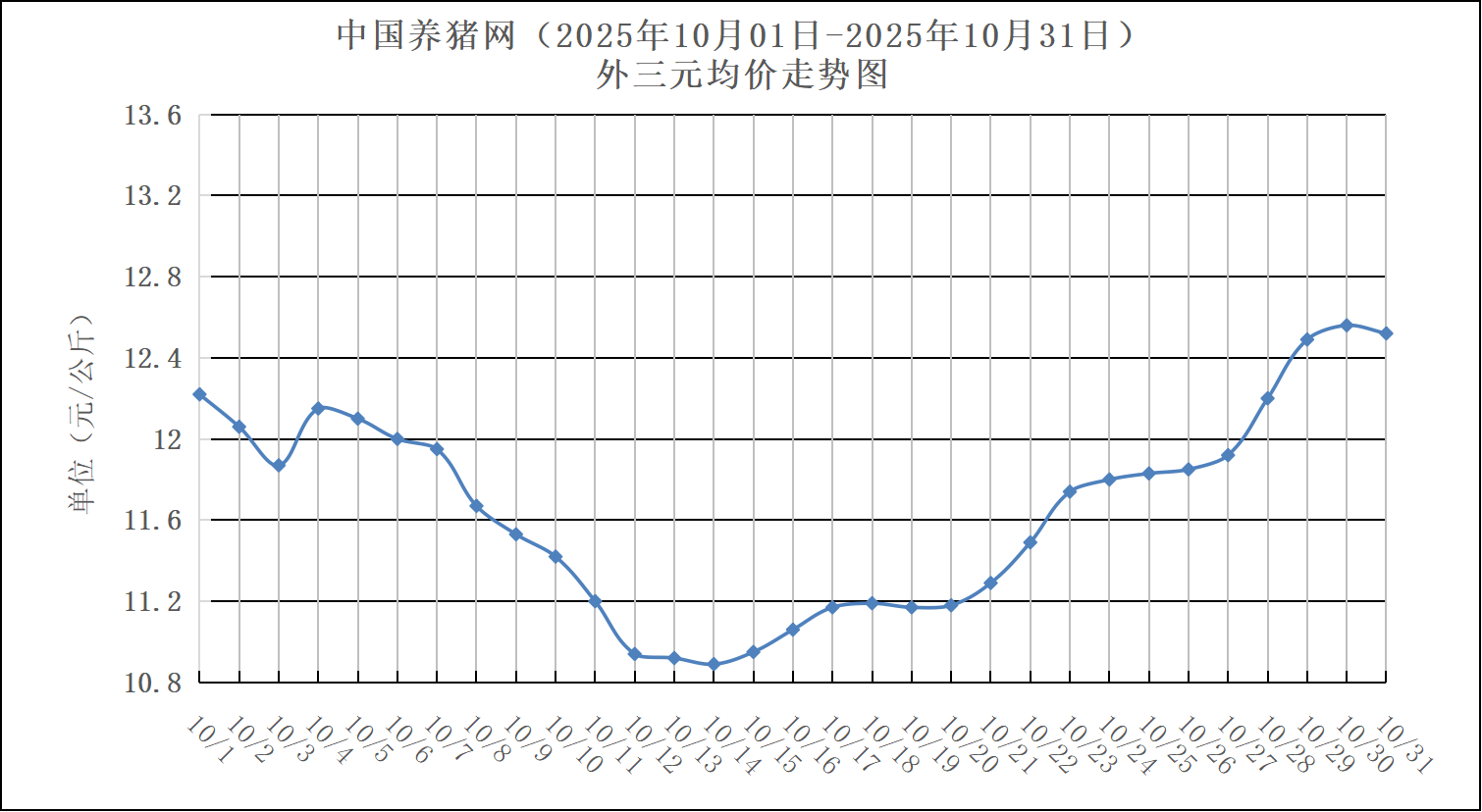 2025年10月31日-中国养猪网生猪(外三元)均价走势图