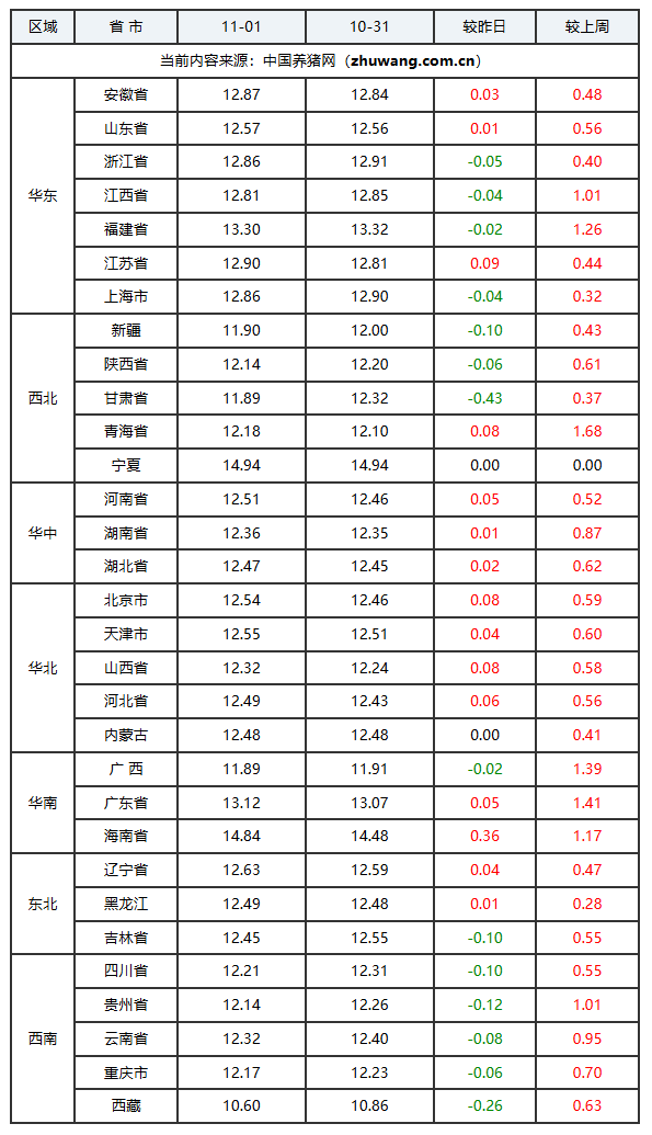 2025年11月01日-中国养猪网生猪(外三元)均价涨跌表