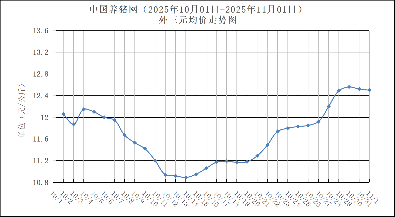 2025年11月01日-中国养猪网生猪(外三元)均价走势图