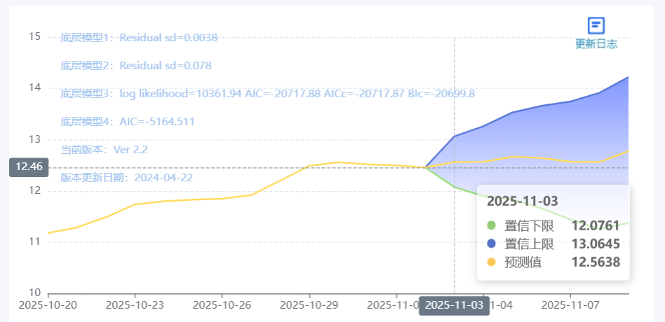 玄田算法是由项目课题组团队原创的非经典逻辑数值聚合理论和不确定性预测方法,构建了基于一致模算子的生猪价格预测模型。该模型采用的聚合函数及一致模相关理论与方法已获得多项国家自然科学基金和省级自然科学资金资助,并获得多项省级自然科学奖奖项。11月03日预测猪价为12.5938,置信区间在12.0761--13.0645之间。11月04日预测猪价为12.5682;11月05日预测猪价为12.6660。