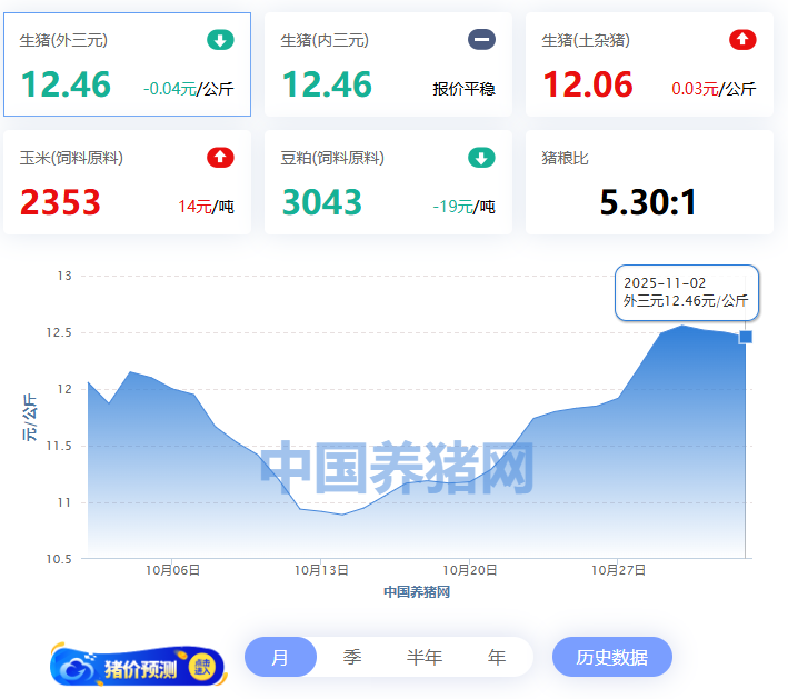 2025年11月02日(星期日),中国养猪网猪价系统数据监测如下:生猪(品种:外三元)均价为12.46元/公斤(6.23元/斤),价格较昨日下跌了0.04元/公斤(0.02元/斤);猪价环比上涨3.32%,同比下跌28.18%。