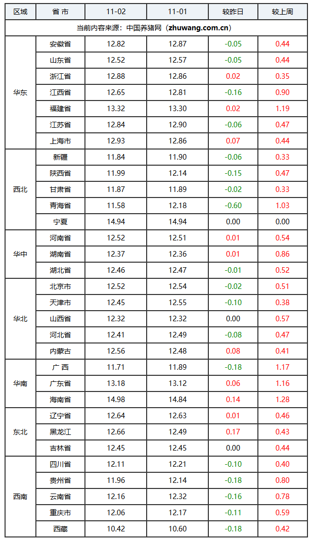 2025年11月02日-中国养猪网生猪(外三元)均价涨跌表
