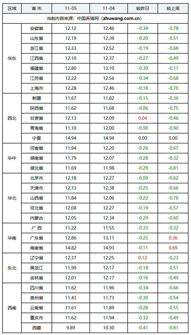 2025年11月05日-中国养猪网生猪(外三元)均价涨跌表