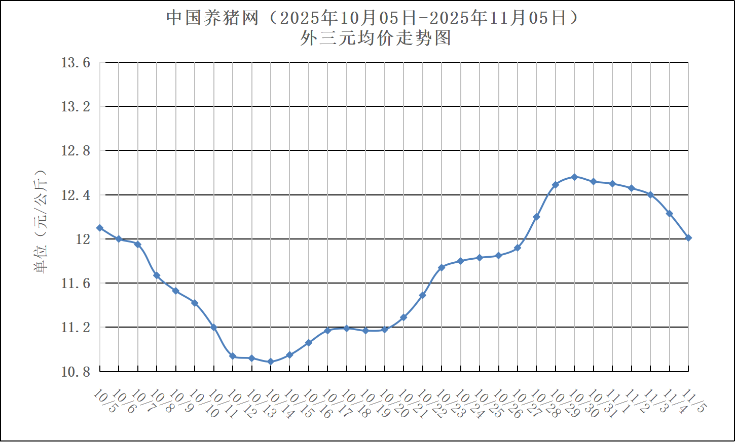 2025年11月05日(星期三),中国养猪网猪价系统数据监测如下:生猪(品种:外三元)均价为12.01元/公斤(6.01元/斤),价格较昨日下跌了0.22元/公斤(0.11元/斤);猪价环比下跌0.74%,同比下跌30.74%。