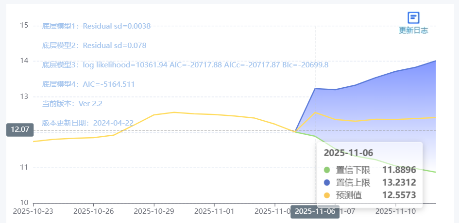 玄田算法是由项目课题组团队原创的非经典逻辑数值聚合理论和不确定性预测方法,构建了基于一致模算子的生猪价格预测模型。该模型采用的聚合函数及一致模相关理论与方法已获得多项国家自然科学基金和省级自然科学资金资助,并获得多项省级自然科学奖奖项。11月06日预测猪价为12.5573,置信区间在11.8896--13.2312之间。11月07日预测猪价为12.3613;11月08日预测猪价为12.3113。