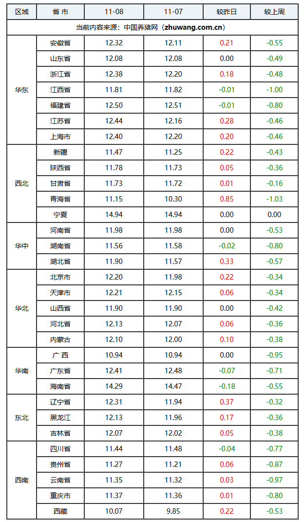 2025年11月08日-中国养猪网生猪(外三元)均价涨跌表