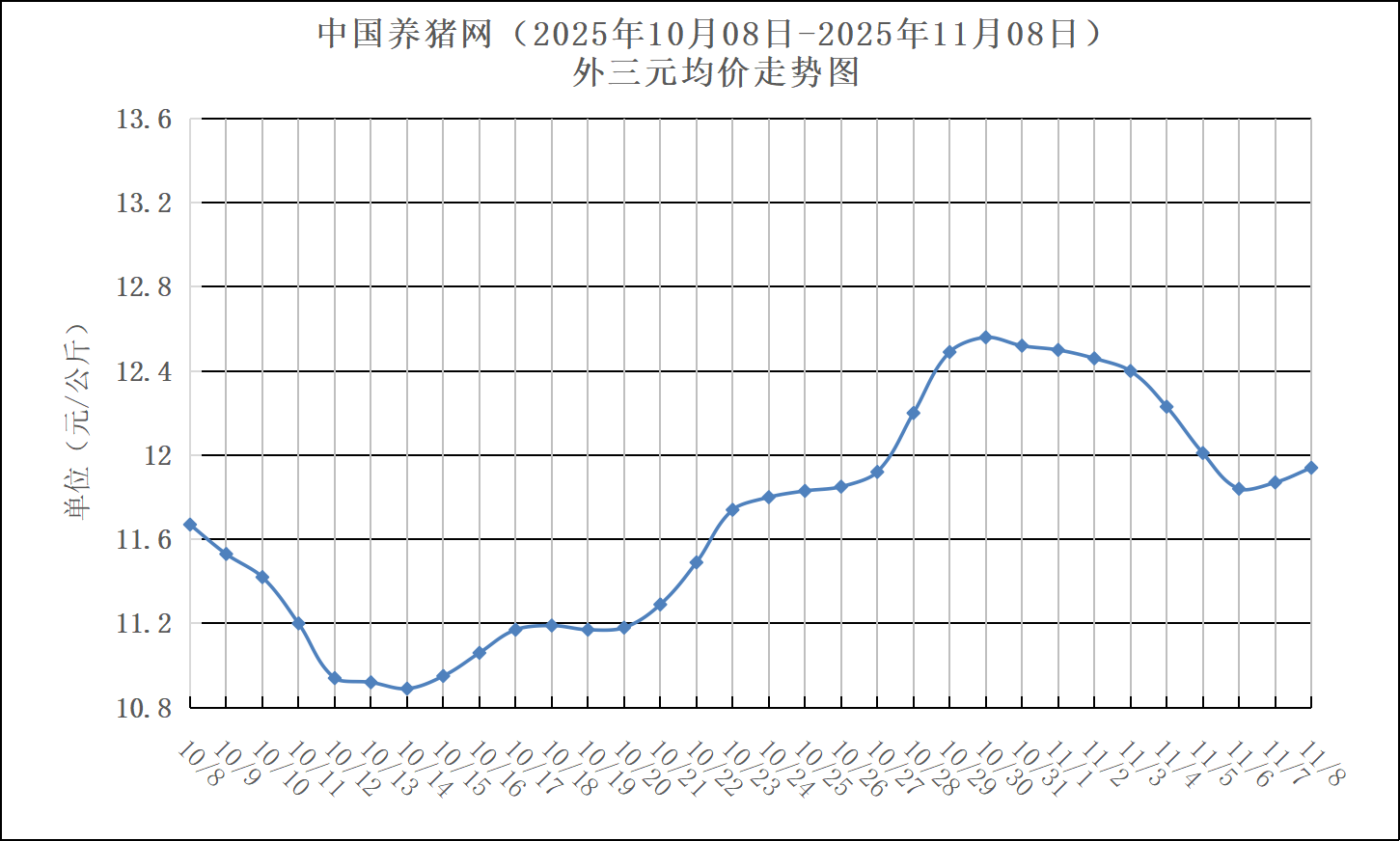 2025年11月08日-中国养猪网生猪(外三元)均价走势图