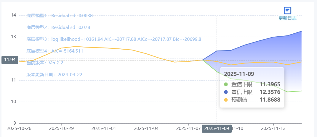 玄田算法是由项目课题组团队原创的非经典逻辑数值聚合理论和不确定性预测方法,构建了基于一致模算子的生猪价格预测模型。该模型采用的聚合函数及一致模相关理论与方法已获得多项国家自然科学基金和省级自然科学资金资助,并获得多项省级自然科学奖奖项。11月09日预测猪价为11.8688,置信区间在11.3965--12.3576之间。11月10日预测猪价为11.7088;11月11日预测猪价为11.7927。
