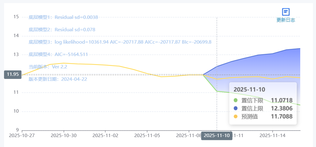 玄田算法是由项目课题组团队原创的非经典逻辑数值聚合理论和不确定性预测方法,构建了基于一致模算子的生猪价格预测模型。该模型采用的聚合函数及一致模相关理论与方法已获得多项国家自然科学基金和省级自然科学资金资助,并获得多项省级自然科学奖奖项。11月10日预测猪价为11.7088,置信区间在11.0718--12.3806之间。11月11日预测猪价为11.7927;11月12日预测猪价为11.8280。