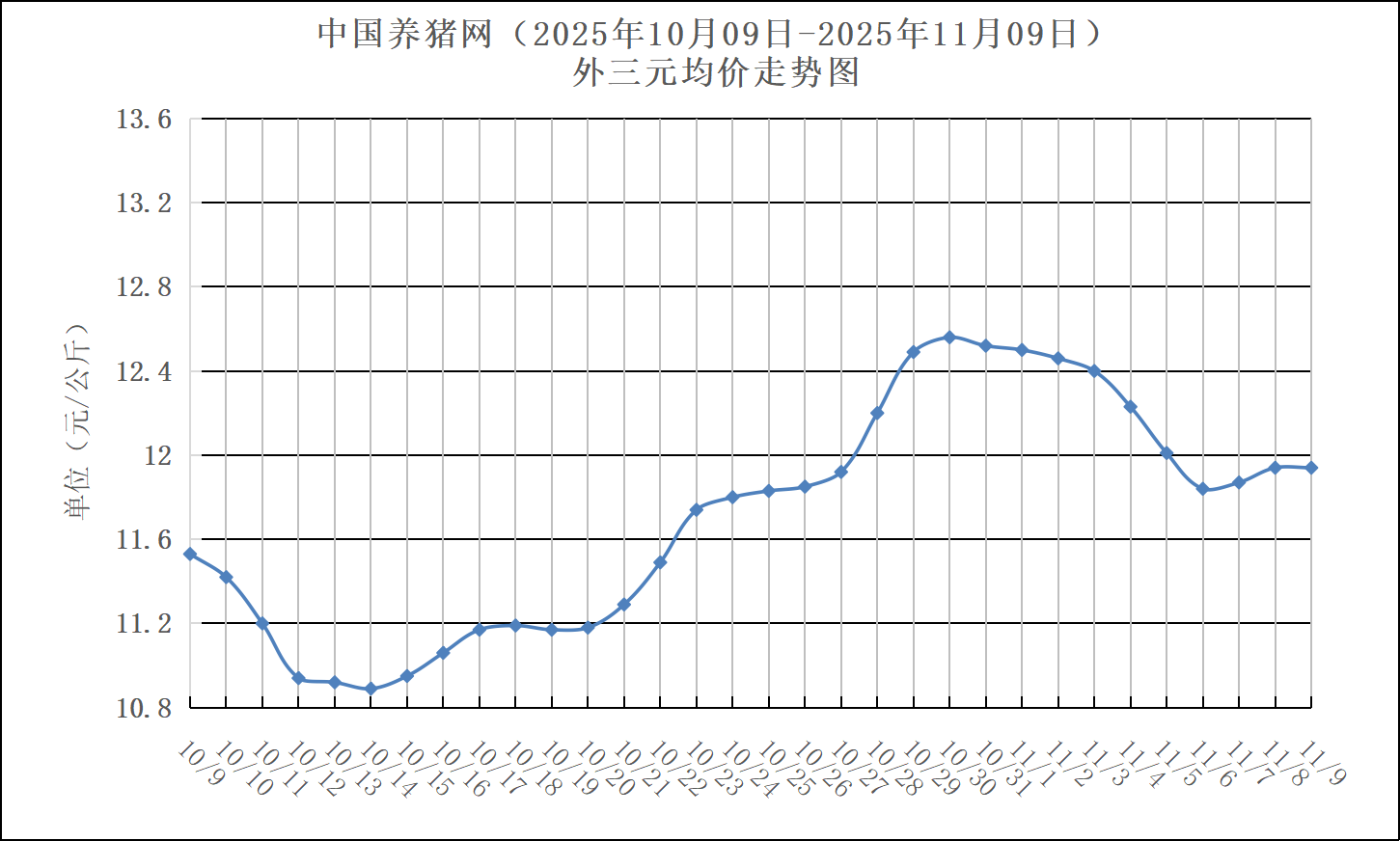 2025年11月09日-中国养猪网生猪(外三元)均价走势图