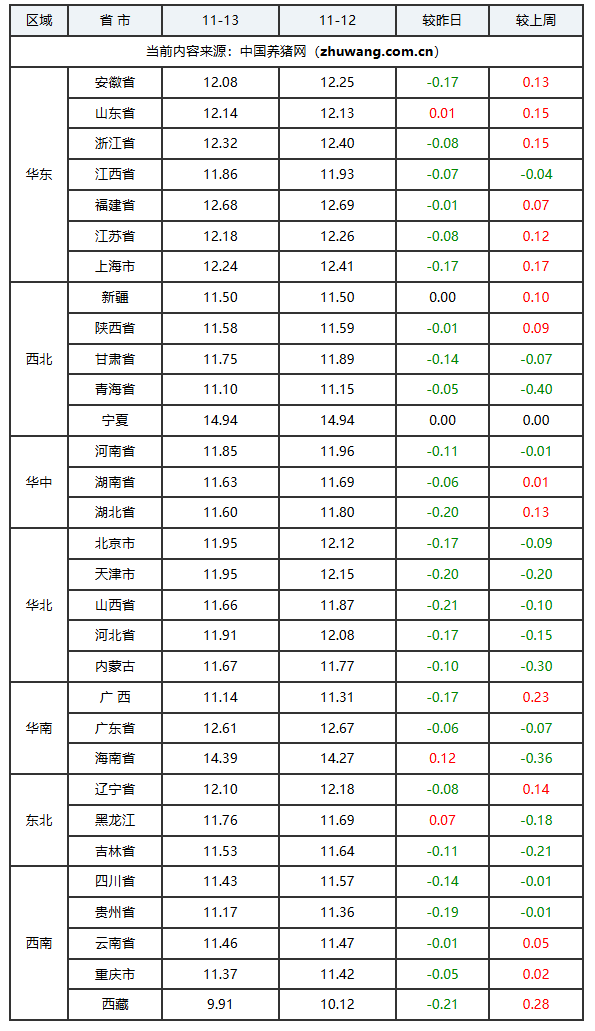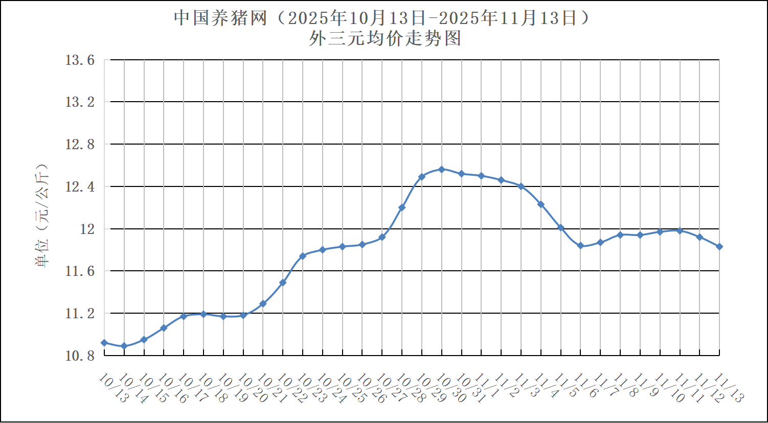 2025年11月13日-中国养猪网生猪(外三元)均价涨跌表