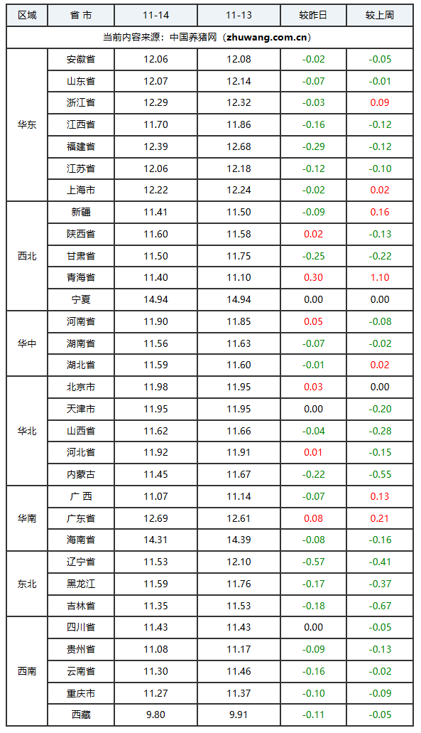 2025年11月14日-中国养猪网生猪(外三元)均价涨跌表