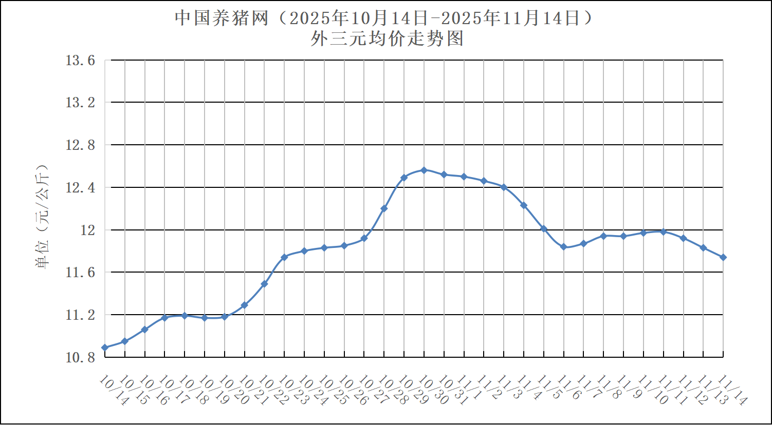 2025年11月14日-中国养猪网生猪(外三元)均价走势图