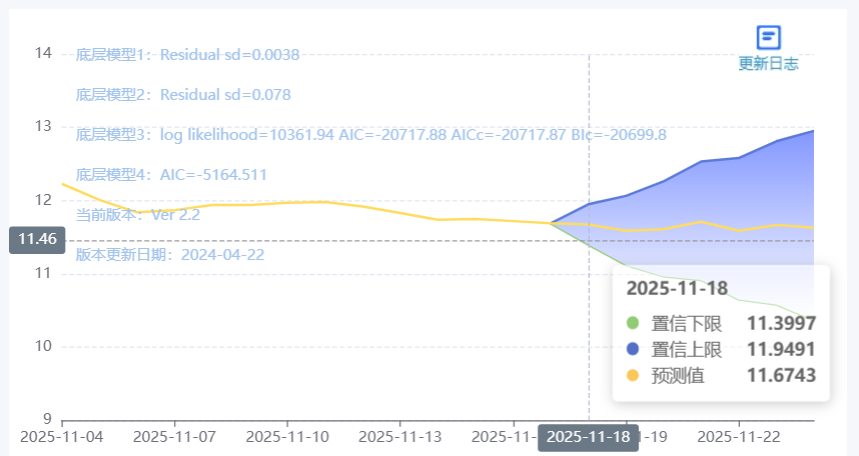 玄田算法是由项目课题组团队原创的非经典逻辑数值聚合理论和不确定性预测方法,构建了基于一致模算子的生猪价格预测模型。该模型采用的聚合函数及一致模相关理论与方法已获得多项国家自然科学基金和省级自然科学资金资助,并获得多项省级自然科学奖奖项。11月18日预测猪价为11.7001,置信区间在11.0575--12.3472之间。11月19日预测猪价为11.7893;11月20日预测猪价为11.7272。