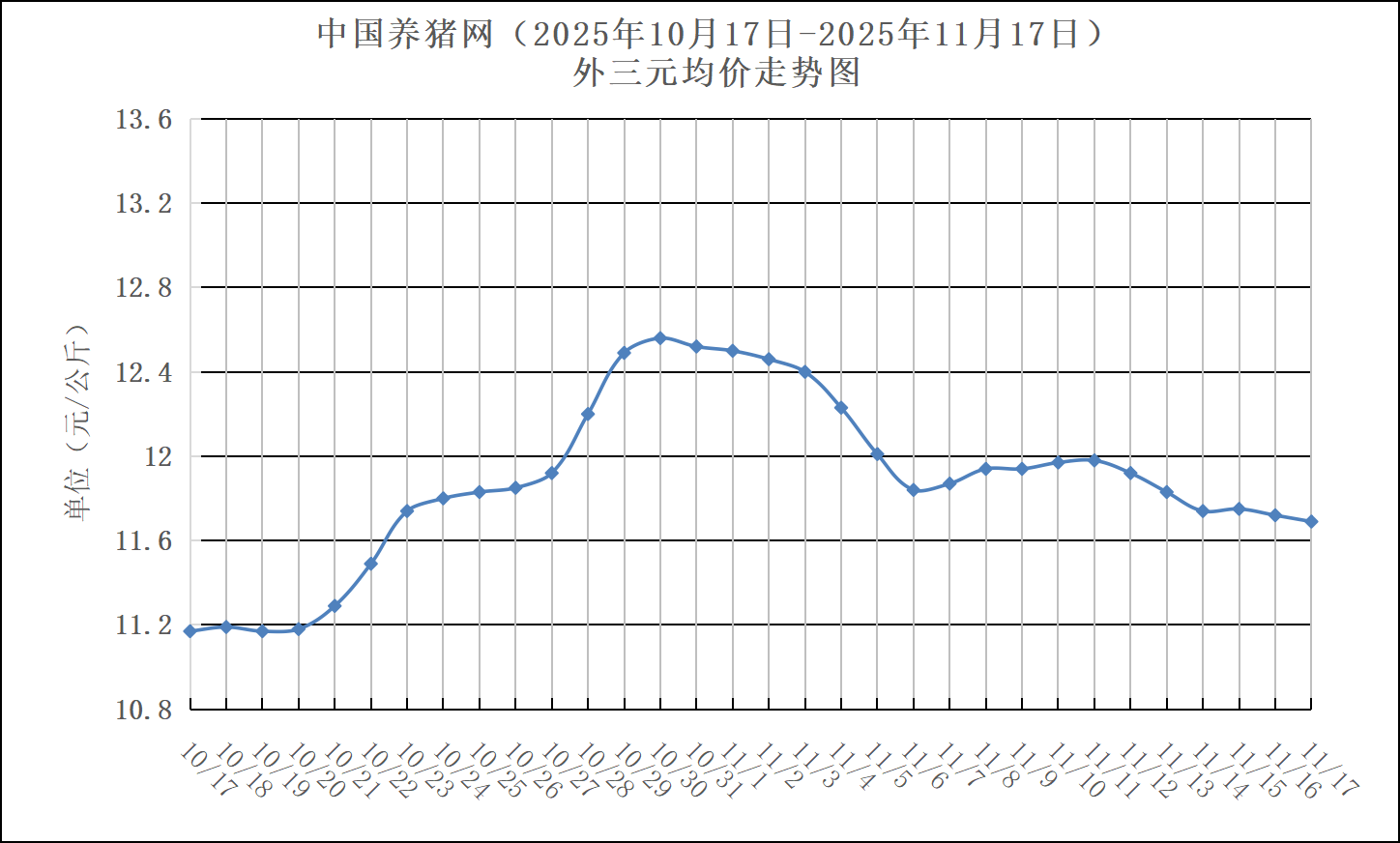 2025年11月17日-中国养猪网生猪(外三元)均价走势图
